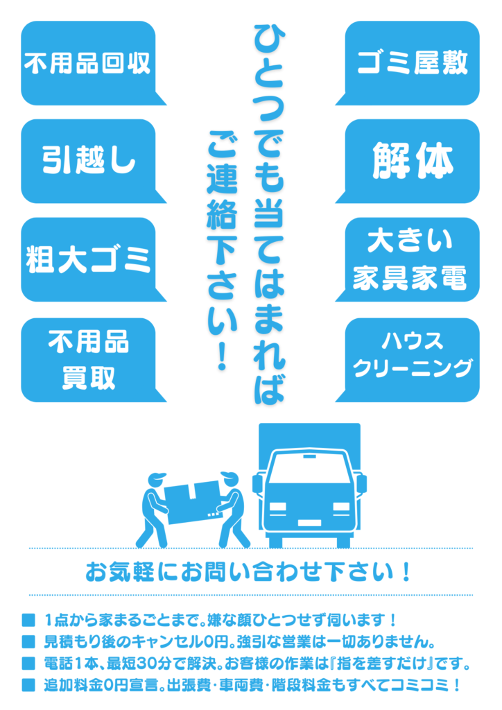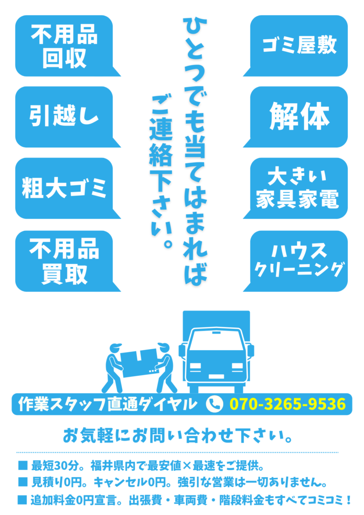 福井県内でこれまでにご依頼頂いたお客様の様々なお声を私達が提供できるサービスに反映して参りました。 不用品の回収に限らず、生活のどんなお悩みでもご相談下さい。